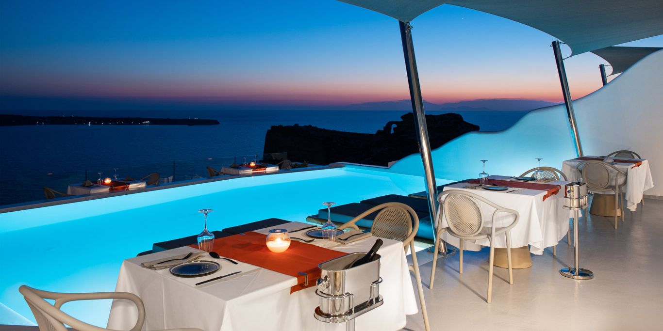 Aspa Restaurant is established in the scenic village of Oia in Santorini, on the northern side of the volcanic island, where the whitewashed buildings, the cobblestoned streets, and the amazing views seduce the travelers. Its entrance is located in the Maregio Hotel in Oia, from where the guests can easily lead themselves into the restauarant. Aspa Restaurant owns an incredible position at Maregio Suites due to its breathtaking views. The incandescent hues of the Santorinian sunset and the attractive swimming pool compose the most romantic scenery to surround you.